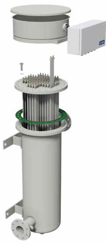 The series 4600 heaters consist of a welded pressure vessel with an electric heating insert. The heating elements are positioned in protection tubes and are not in direct contact with the medium. They can be exchanged without draining and opening the pressure vessel. The design of the heating elements ensure excellent thermal reaction time and control accuracy.